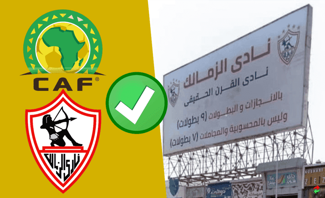 ولم يضع مسؤولو الزمالك شعار الكاف على اللافتة الجديدة، وقام النادي بتعديل النص المكتوب عليها، حيث كتب: “الزمالك نادي القرن الحقيقي بالإنجازات والبطولات (9) وليس بالمحسوبية والمجاملات (7)”.
